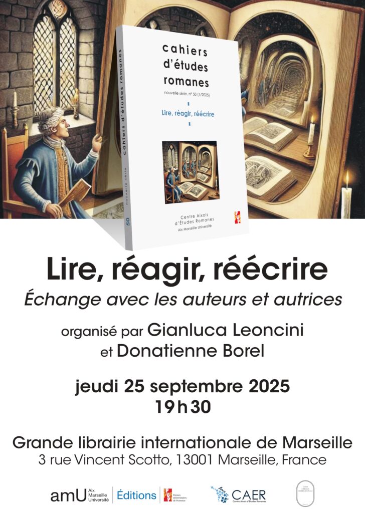 Le 25 septembre, à partir de 19h30, Donatienne Borel (CAER, AMU) et Gianluca Leoncini (CAER, AMU) vont présenter à la Grande Librairie Internationale de Marseille (3, rue Vincent Scotto, 13001) « Lire, réagir, réécrire » (n° 50 des Cahiers d’études romanes). Ce sera un échange avec les auteurs et les autrices ; Mohamed Bakhouch (IREMAM) et Greta Gribaudo (CAER) seront également présents.