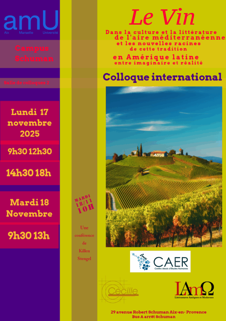 Colloque Le vin dans l’aire méditerranéenne, 17-18/ 11/2025, Salle des Colloques, Aix-en-Provence, 21 octobre 2025/dans A la une, Actualité Recherche, Frontpage Article, News /par Claudio Milanesi Programme Vin Colloque_Vin_Liens_Zoom_AixMarseille https://caer.univ-amu.fr/wp-content/uploads/original-EDA0FCB8-7D79-4C29-AE36-A229F07508DD1.png 1200 848 Claudio Milanesi http://caer.univ-amu.fr/wp-content/uploads/logook-1.png Claudio Milanesi2025-10-21 10:21:412025-10-21 10:22:18Colloque Le vin dans l'aire méditerranéenne, 17-18/ 11/2025, Salle des Colloques, Aix-en-Provence,