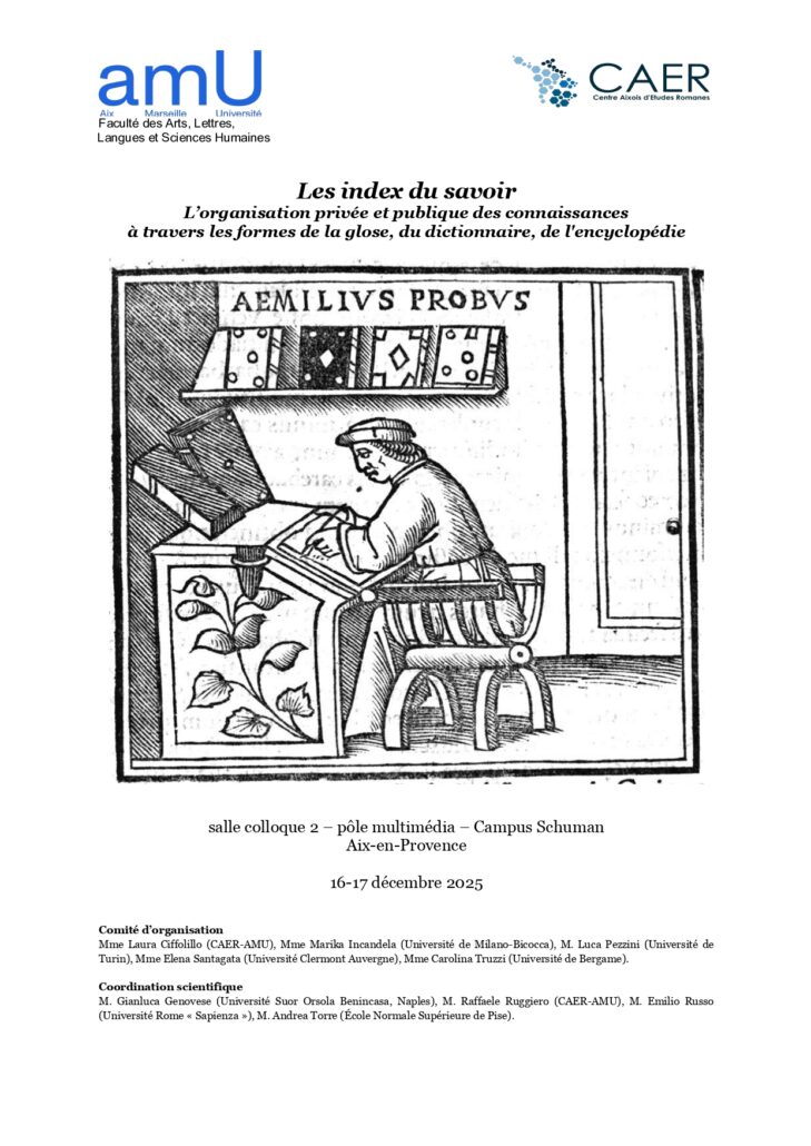 Le but de ce colloque est d’explorer les formes d’organisation du savoir du XIVe au XXIe siècle : la glose, le dictionnaire, l’encyclopédie, les infrastructures numériques. Notre approche sera interdisciplinaire, impliquant des chercheurs de différentes aires disciplinaires (littéraire, philosophique, sociologique et sémiotique), qui visent à déceler une préhistoire et une histoire de l’encyclopédisme. Le but de la recherche sera donc d’identifier les paradigmes gnoséologiques sous-jacentes à cette typologie textuelle, compris dans leur évolution diachronique, et en même temps considérer la manière dont l’image du monde s’est modifiée au cours du temps sur la base de la transformation de méthodes, d’outils épistémologiques et des critères d’organisation des connaissances.