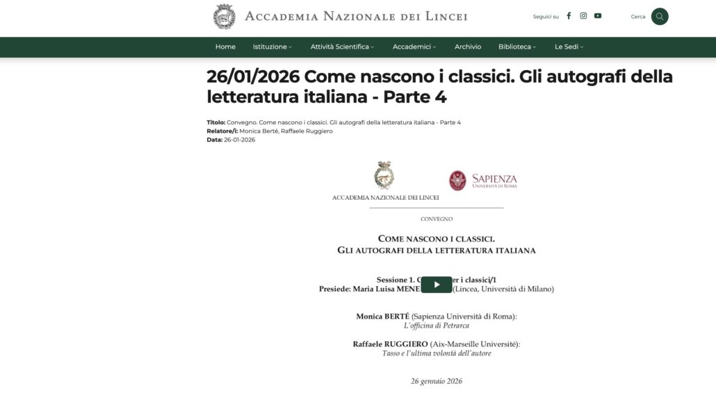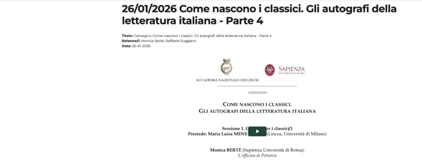 Come nascono i classici (colloque Accademia dei Lincei 26-28 janvier 2026) – streaming publié